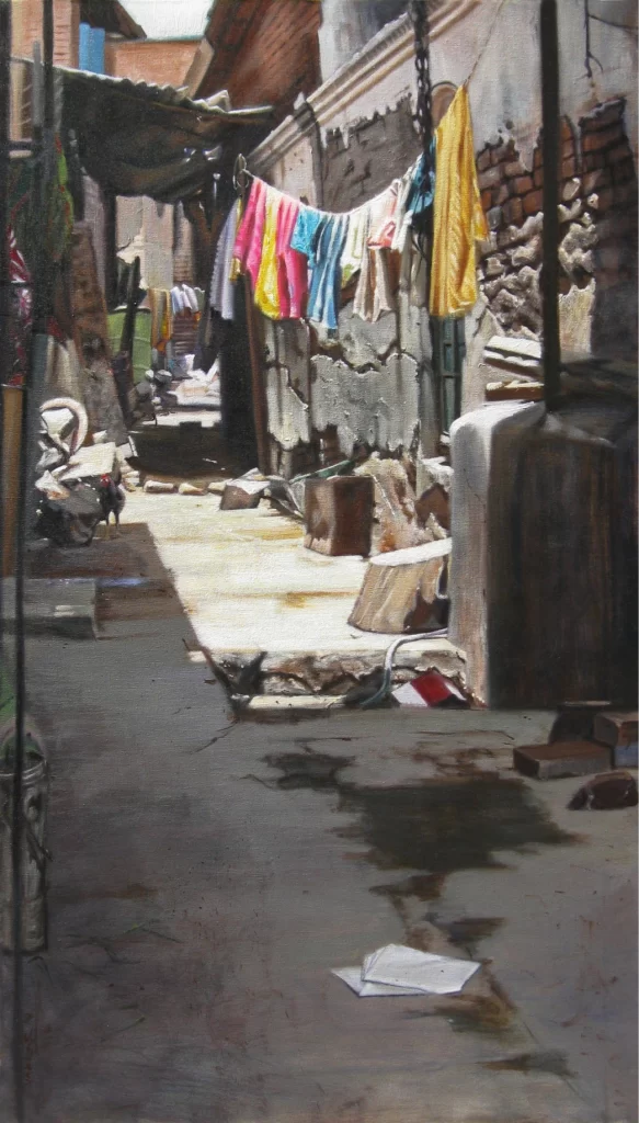Quiet Contemplation: Despite depicting an ordinary lane, the painting