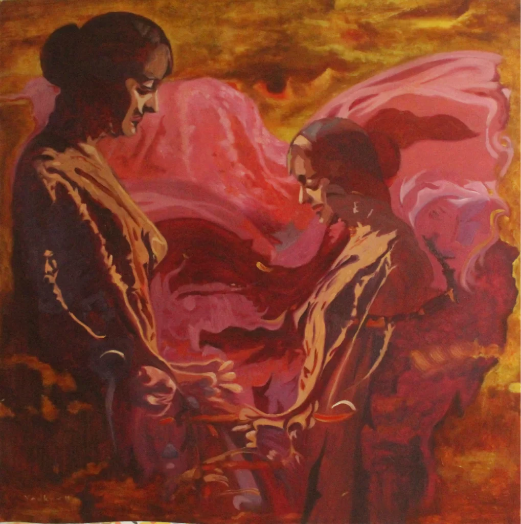 The work appears to lean toward an expressive form of figuration. The brushwork, particularly in the background and the swirling fabric, seems loose and energetic, contrasting with the more defined forms of the women. This blend of definition and dynamic abstraction heightens the emotional charge, suggesting that the “bond” is a living, breathing, energetic force—not just a static relationship.