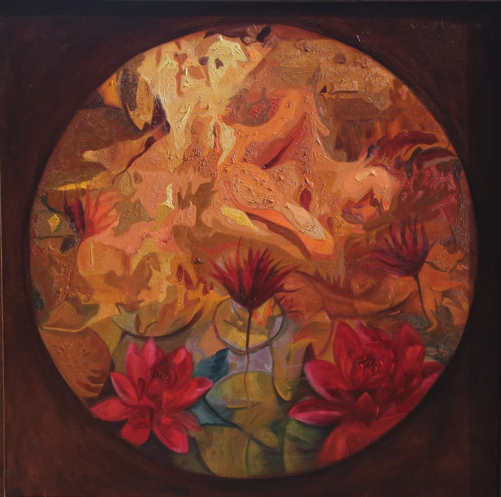 - The painting is framed within a distinct circular central motif, which immediately draws the eye and creates a sense of focused intensity, like a portal or a reflection on a pool’s surface. The outer, darker brown border acts as a grounding contrast, pushing the vibrant circular scene forward.